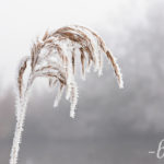 Ein trockener Blütenstand vom Schilf mit Raureif im Nebel