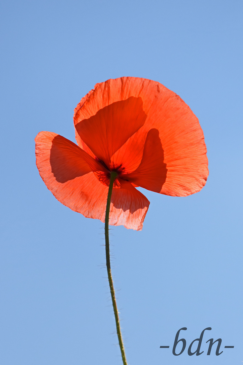 Klatschmohn im Gegenlicht vor blauem Himmel